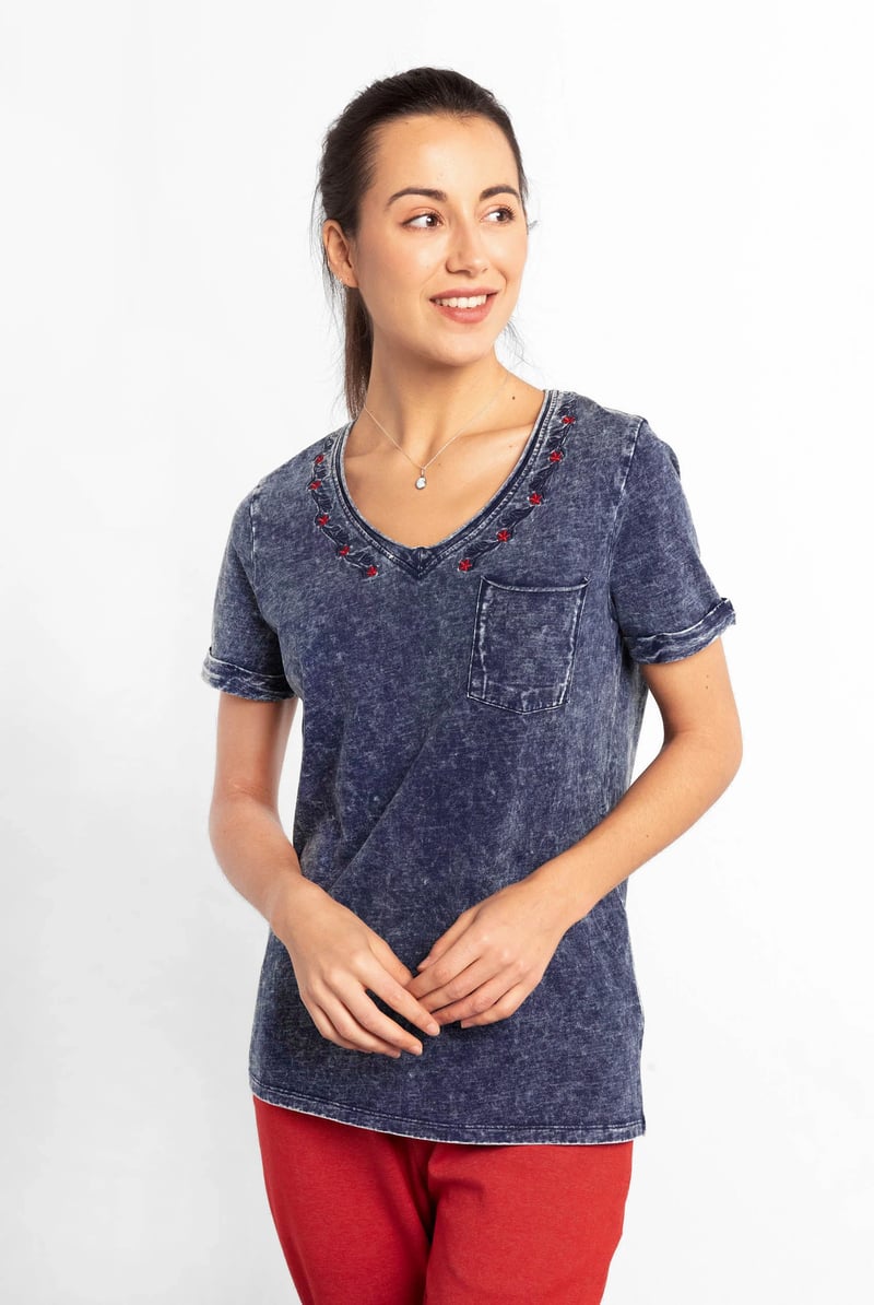 Indigo Washed Embroidered V-Neck T-shirt: Made from 100% soft cotton, this T-shirt has a V-neck. It features elegant embroidery and folded sleeves t shirt for a classic look. Its breathable and comfortable nature makes it suitable for all-day wear.