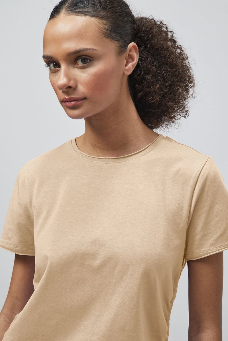 Ruched Side Seam T-Shirt: This loose fit T-shirt stands out with its ruched side seam and adjustable tie detail, a round neck with raw edges, and short sleeves. The blend of 95% cotton and 5% elastane feels soft and stretchy. This mix gives a casual, adjustable, and comfortable style.